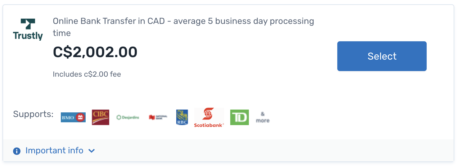 - Create your payment request: Start your request at pay.flywire.com. Select the payment method “Online Bank Transfer in CAD” (look for the Trustly logo) and enter the required information.