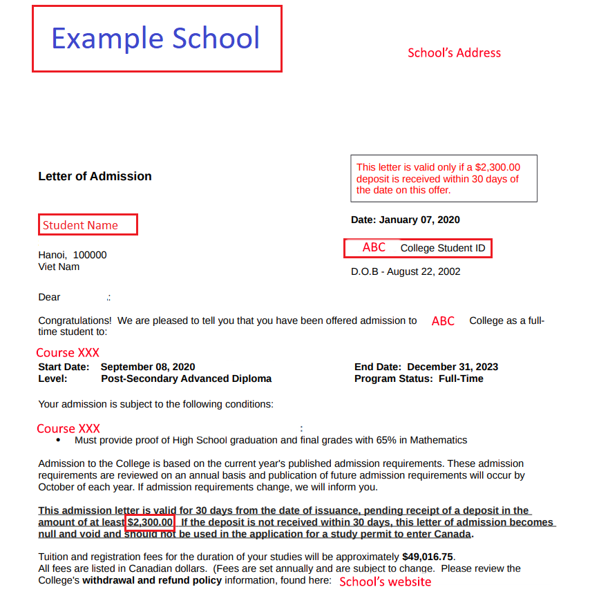 The invoice provided by your educational institution or travel company must clearly display these three details: