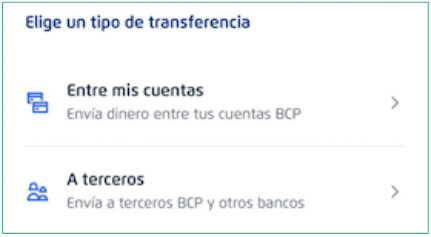 - Log in to the BCP app and select the Transfer money (Transferencias) option from the main menu.
