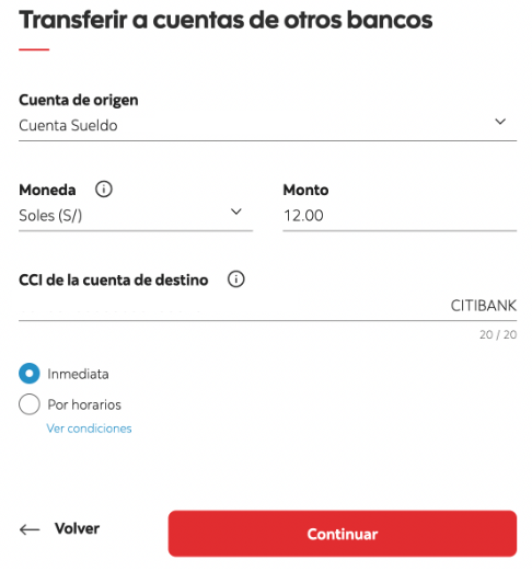 - Find and select the option to make an Immediate interbank transfer (Transferencia interbancaria inmediata), then proceed to enter the Citibank account details.