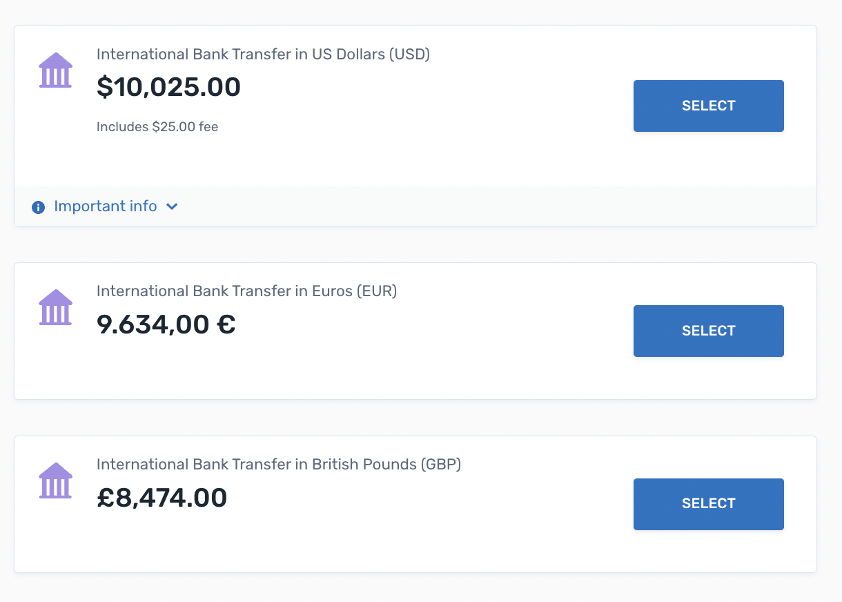 Choose the correct method: Select "International Bank Transfer" in your invoice's destination currency (e.g., USD, CAD, GBP, EUR). Do not select NGN for this specific process.