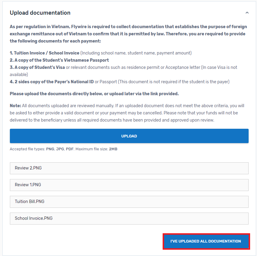 Bạn có thể tải lên tài liệu của mình ngay sau khi tạo yêu cầu thanh toán. Nếu bạn muốn tải chúng lên sau, chỉ cần sử dụng đường link liên kết được bao gồm trong email xác nhận mà Flywire gửi cho bạn sau khi yêu cầu thanh toán của bạn được tạo thành công. Xin lưu ý rằng bạn phải tải lên các tệp này trước khi có thể truy cập hướng dẫn thanh toán của mình.